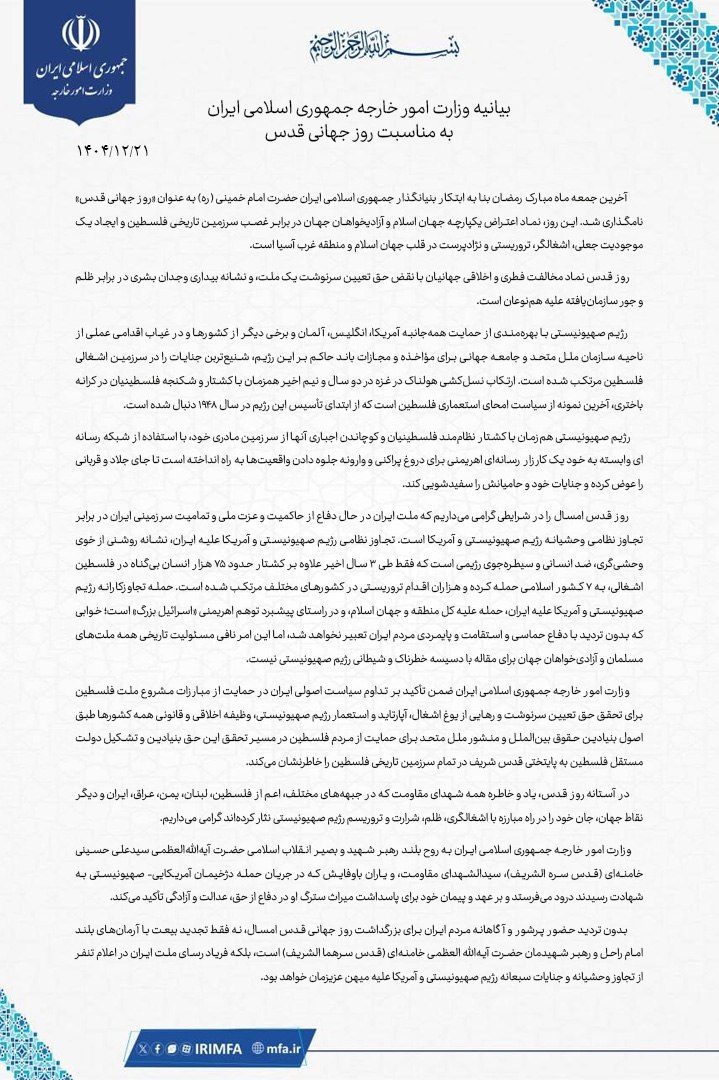 بیانیه وزارت امور خارجه جمهوری اسلامی ایران به مناسبت روز جهانی قدس