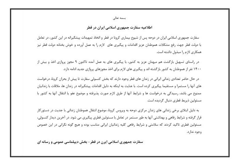 اطلاعیه سفارت جمهوری اسلامی ایران در قطر