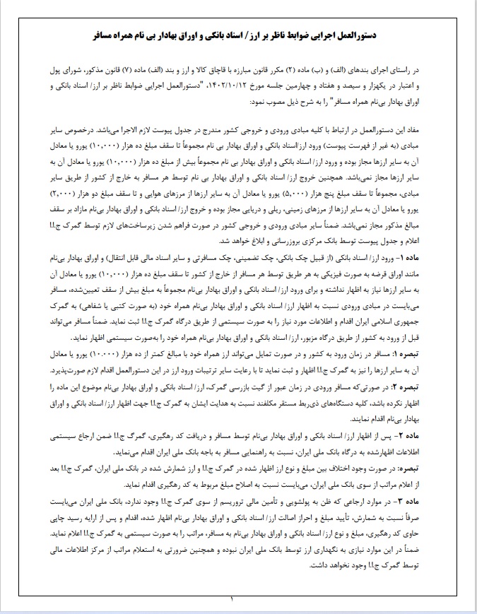 بانک مرکزی جمهوری اسلامی ایران، دستورالعمل اجرایی ضوابط ناظر بر ارز، اسناد بانکی و اوراق بهادار همراه مسافر را صادر کرد.